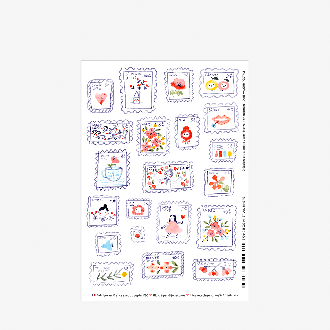 Une belle planche de stickers où l’on découvre 21 timbres conçus et illustrés par Julie Adore. On y retrouve son style inimitable – ses dessins joyeux, ludiques, charmants et colorés – et bien sûr, ses petits messages plein d’attention, pour faire plaisir et se faire plaisir.